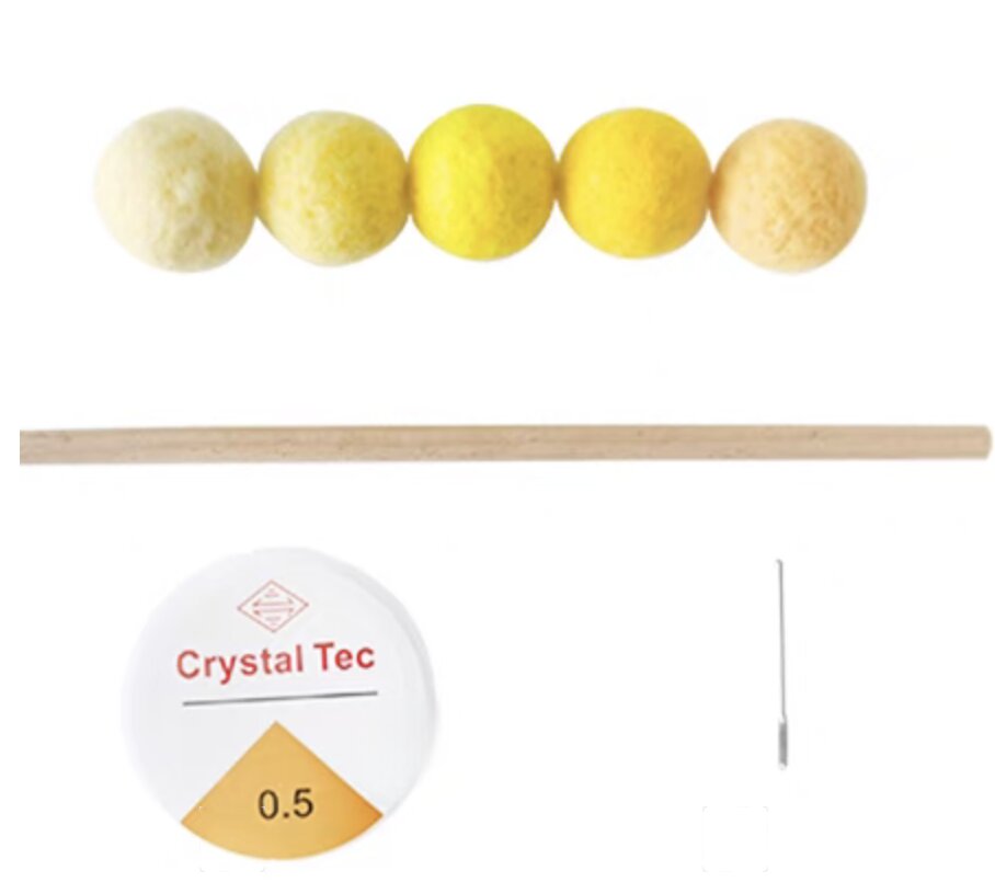 Vizualno usmerjen Montessori material za dojenčke, namenjen zgodnjemu razvoju vida in koncentracije. Pet kroglic v stopničastih odtenkih rumene barve spodbuja razlikovanje barv, globinsko zaznavanje in dinamično sledenje s pogledom. Zasnovano kot naslednji korak po uvodnih mobilih.
