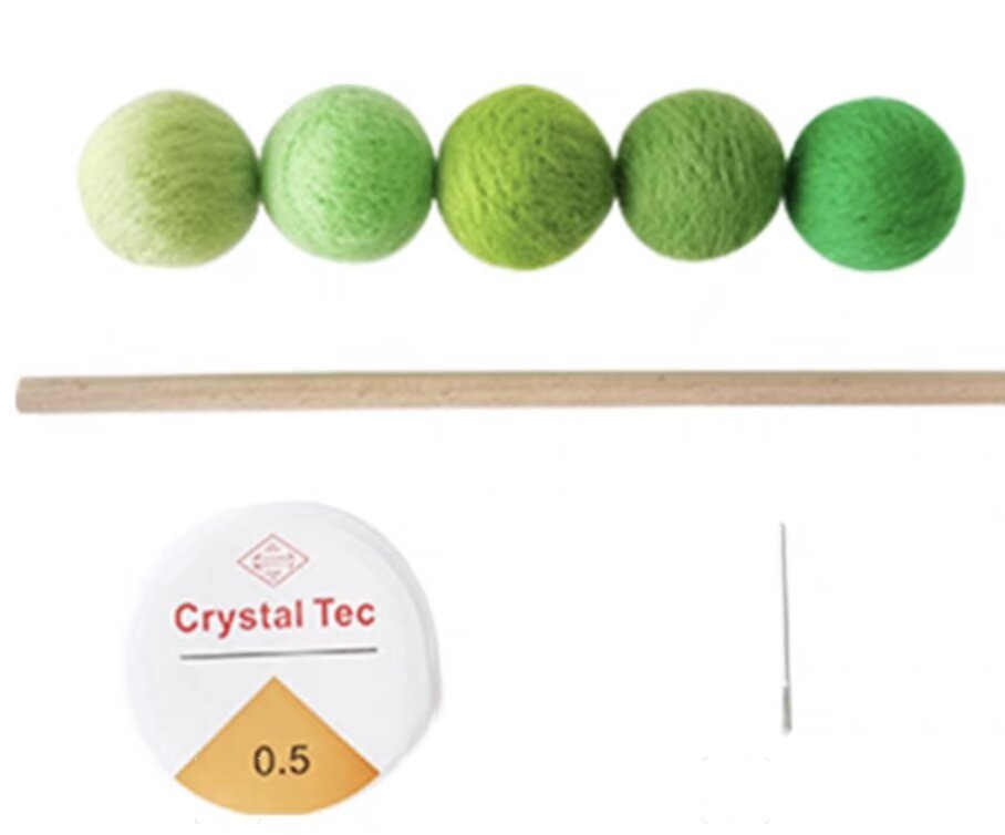 Vizualno usmerjen Montessori material za dojenčke, namenjen zgodnjemu razvoju vida in koncentracije. Pet kroglic v stopničastih odtenkih zelene barve spodbuja razlikovanje barv, globinsko zaznavanje in dinamično sledenje s pogledom. Zasnovano kot naslednji korak po uvodnih mobilih.