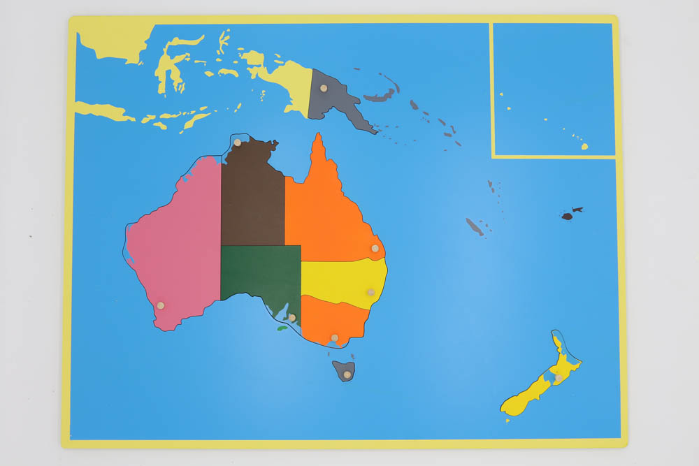 Sestavljanka se uporablja po predhodnem delu z sestavljanko celin. Otroku razložimo, da se posamezne celine tudi razdelijo na države.Otrokom pomaga pri lažji predstavi, kje ležijo posamezne države, kje je preživel počitnice…Ko delate s sestavljanko Avstralija, se otrok uči o kulturnih znamenitostih posameznih držav, legi ali ima posamezna država tudi morje ali ne, katere živali živijo v posameznih državah, kater jezik govorijo v posameznih državah…. Lahko se uporablja v kombinaciji skupaj s kontrolno karto.Velikost zemljevida je pribl. 57,5cm x 44,5cm .